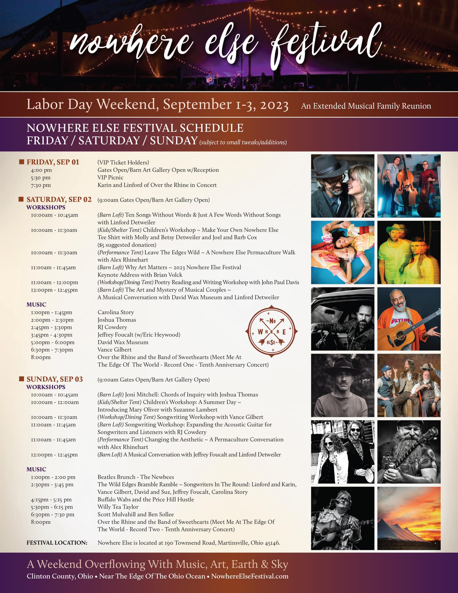Finally, none of this would be possible without the investors and donors, who have stepped forward over the years to support the vision of Nowhere Else with funding and financial gifts. A place where music, the arts, community and a piece of unpaved earth can all flourish.